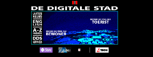 How did the designers use the metaphor of city? At the home-page, the most visible use of the metaphor is that the potential user who wants to enter DDS has to decide whether to pay a visit to the city (access the interface) as an inhabitant or as a tourist (see figure I: bezoek de stad als bewoner or toerist). Inhabitants of DDS are users who have filled out an on-line form in DDS with their name, address and phone-number. Inhabitants of DDS get an e-mail account (accessible via the post-office), they can build a house (design a homepage) and they can participate in the cafés or other interactive environments of DDS. These kinds of facilities are denied to tourists, users who have not subscribed to DDS, because the designers of DDS want to have some control about the content in DDS (interview help-desk participant). Entering the city as a tourist will take the user to the central square, an octagon which is connected to several other such squares, each with their own theme. In the following figure, the main part of the home-page of DDS 3.0 is shown.
